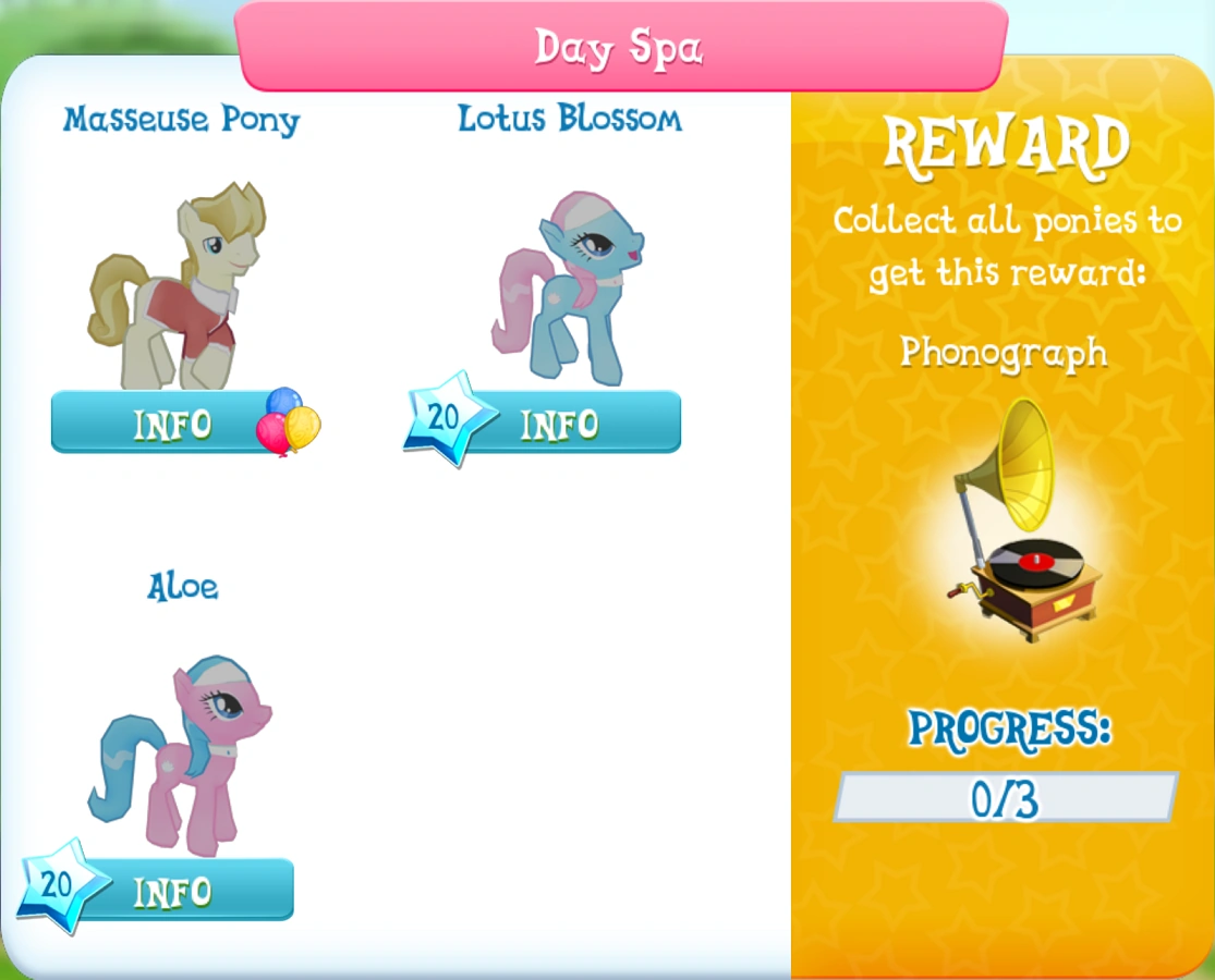 Aloe lives in the Day Spa in Canterlot. She is a bright pink earth pony who works at the Day Spa, she is also known as "Spa Ponies" with Lotus Blossom.