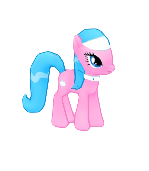 Her coat is a bright pink color and her eye is light ocean blue. Her mane and tail color is light blue and wears white necklace and has a light ocean blue oval-shaped accessory in the middle. Her cutie mark represents a white lotus flower.