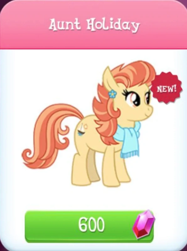 Aunt Holiday is an Earth pony mare added in Update 6.3. She is Snap Shutter's older sister, Scootaloo's paternal aunt, and Auntie Lofty's special somepony.