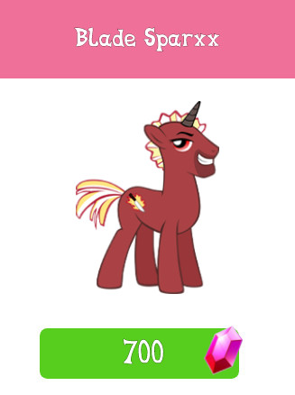Blade Sparxx is a unicorn that came from Las Pegasus and was one of the contestants in the Equestria Super Chef Competition and a helper in the Holiday Super Chef Competition Blitz Story.