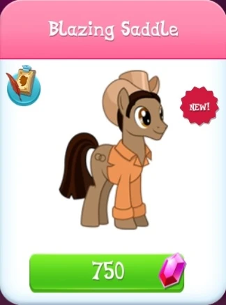 Blazing Saddle is an Earth pony stallion added in Update 7.4. He is a helper in siege stage 4 of the High Plains Ponies Limited-Time Siege. His name, design, and character description all allude to the 1974 dark comedy film Blazing Saddles. His description, specifically, alludes to the movie's protagonist.