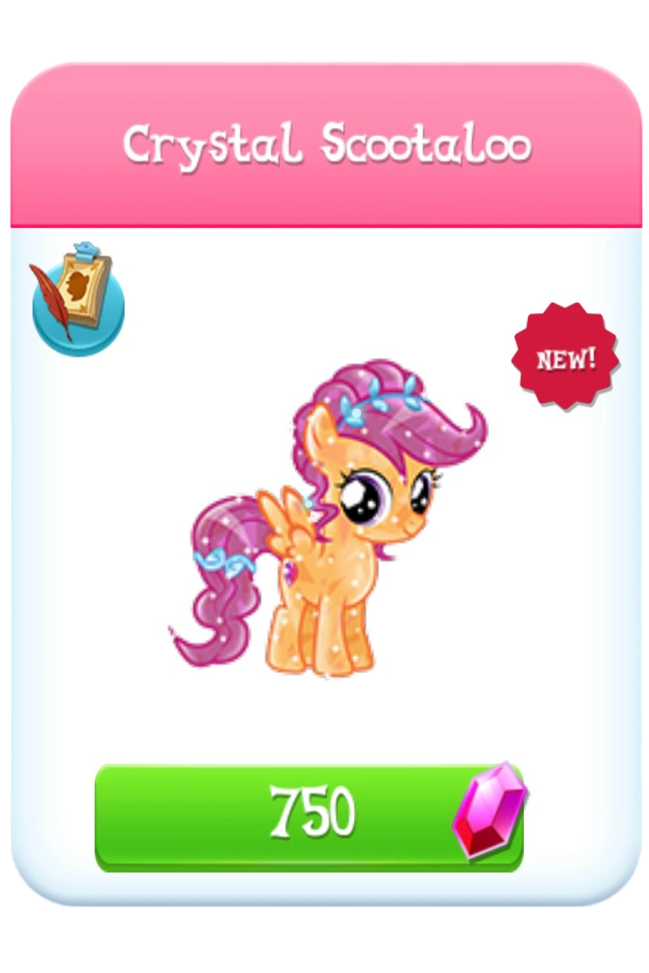 Crystal Scootaloo, is a variant of Scootaloo who lives in the Crystal Empire. She was added in Update 9.7.