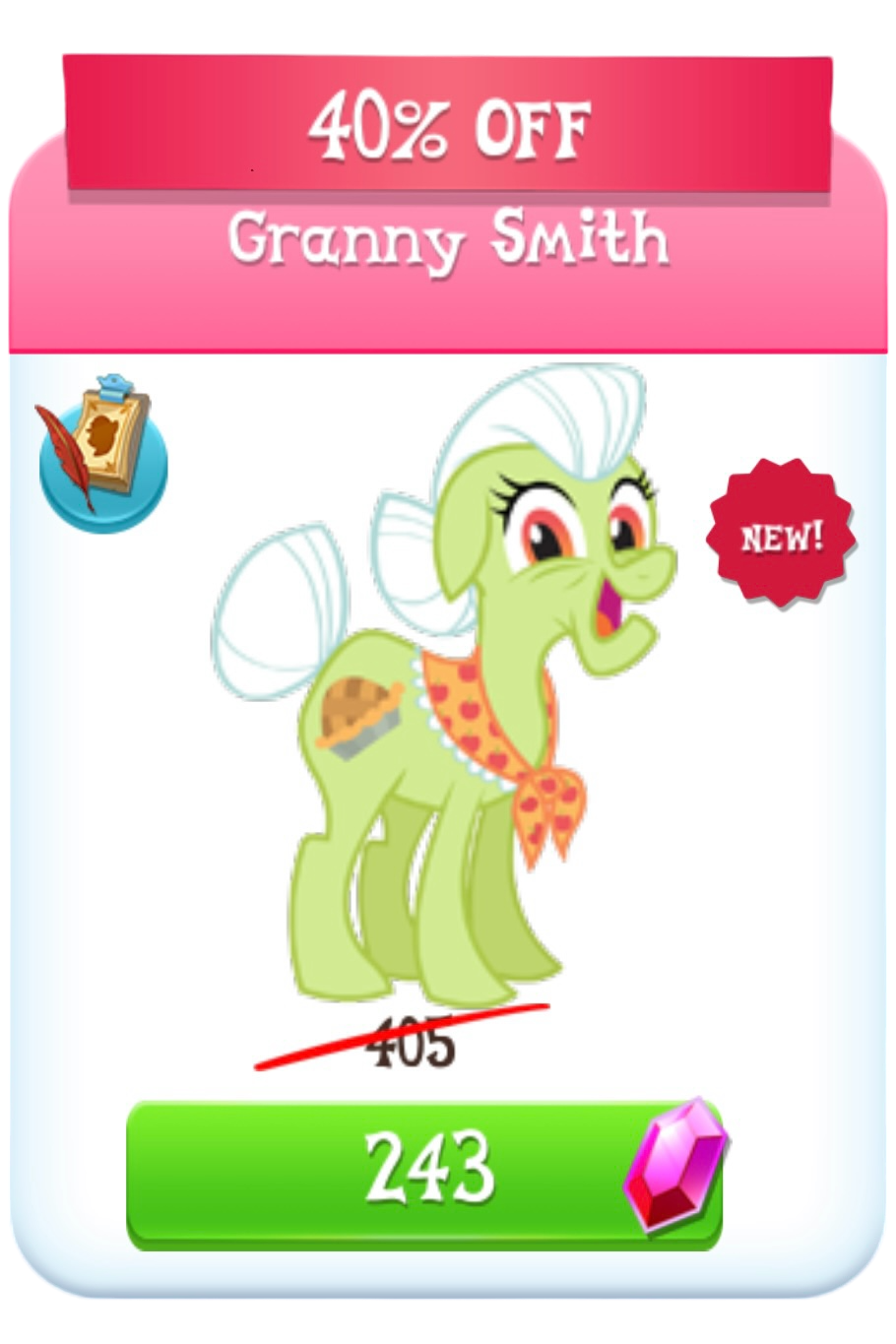 Granny Smith is Big McIntosh's, Applejack's, and Apple Bloom's grandmother. She was added in the Sweet Apple Acres update. Like the princesses, she starts out with 5 stars and thus cannot play minigames except the Minecart minigame due to old age.