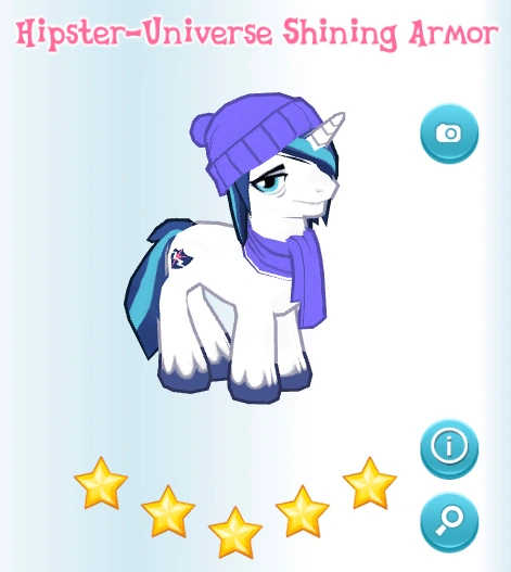 Hipster-Universe Shining Armor is a variation of Mirror-Universe Shining Armor. He can be obtained as a reward in The League of Evil Limited-Time Siege.