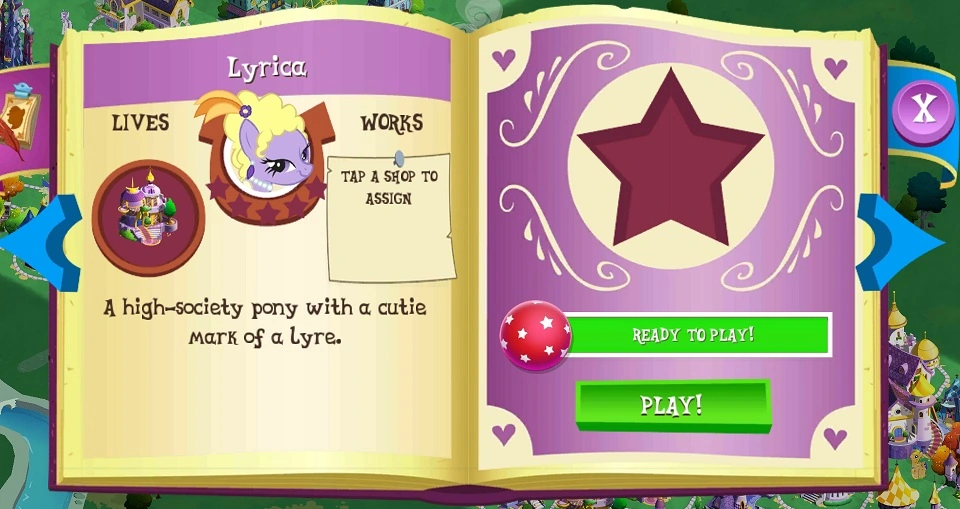 Lyrica Lilac is an earth pony mare who lives in Lyrica Lilac's House in Canterlot. She is available at level 20; this was raised from 10.