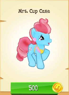 Mrs. Cup Cake is a baker earth pony. She is married to Mr. Cake and lives in Sugarcube Corner with him and Pinkie Pie. She costs 500