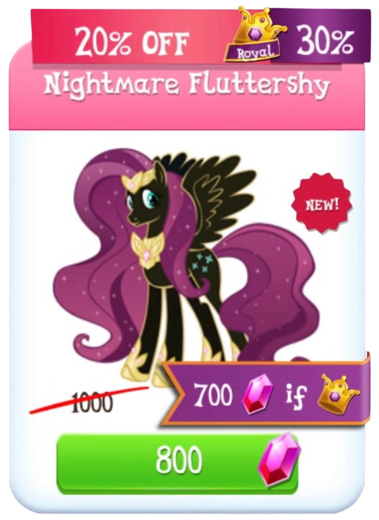 | Welcome Bundle | $49,99 | Real Sale | Bundled with: - Nightmare Applejack - Nightmare Moon - Nightmare Rainbow Dash - Nightmare Fluttershy - Nightmare Rarity - Nightmare Pinkie Pie |