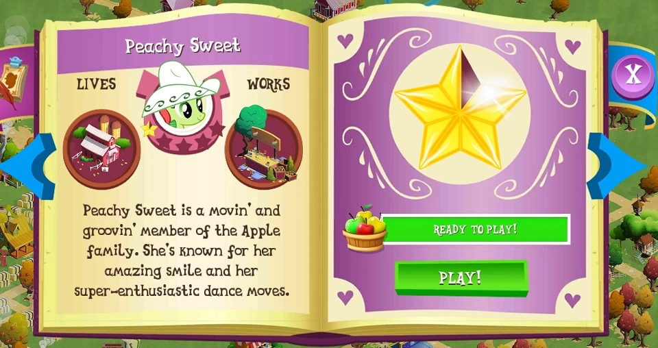 Peachy Sweet is a member of the Apple family who lives in Charming Bunkhouse in Sweet Apple Acres. She was added in the Sweet Apple Acres update. "Something Sweet"SAA has two tasks in which she must be welcomed and then assigned to the Zap Apple Stand.