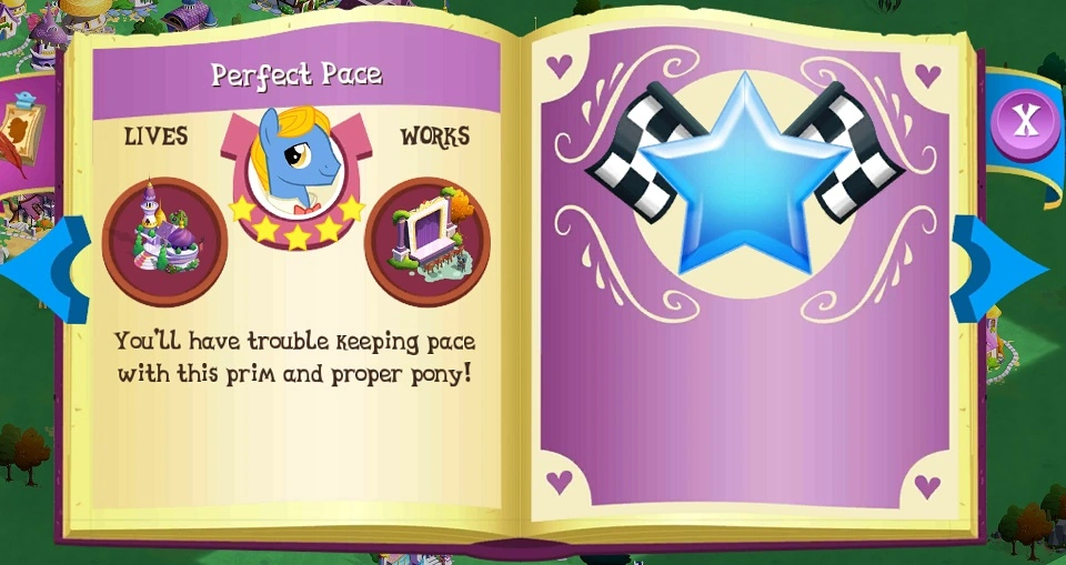 Perfect Pace is a pony who lives in Perfect Pace's Perfect Place in Canterlot. He was available as reward from sapphire-priced Balloon Pop game mode exclusive to Battle with Dragons event (as of May 2015).