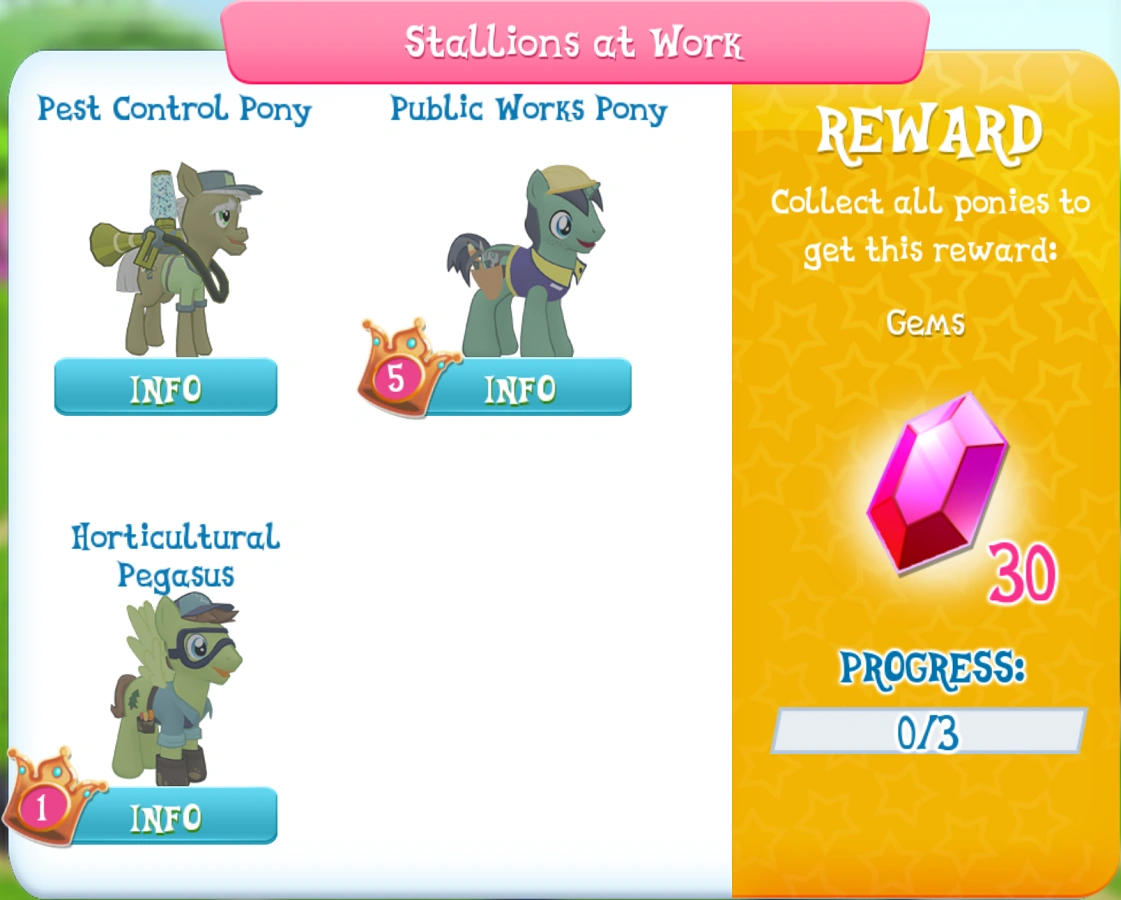 Pest Control Pony is the primary Twittermite and Parasprite exterminator of Equestria. He was recently added in the v2.5 update for the game, as a prize earned in the Gem Balloon Pop game. He lives in the Pest Control Pony's Wagon in Sweet Apple Acres.