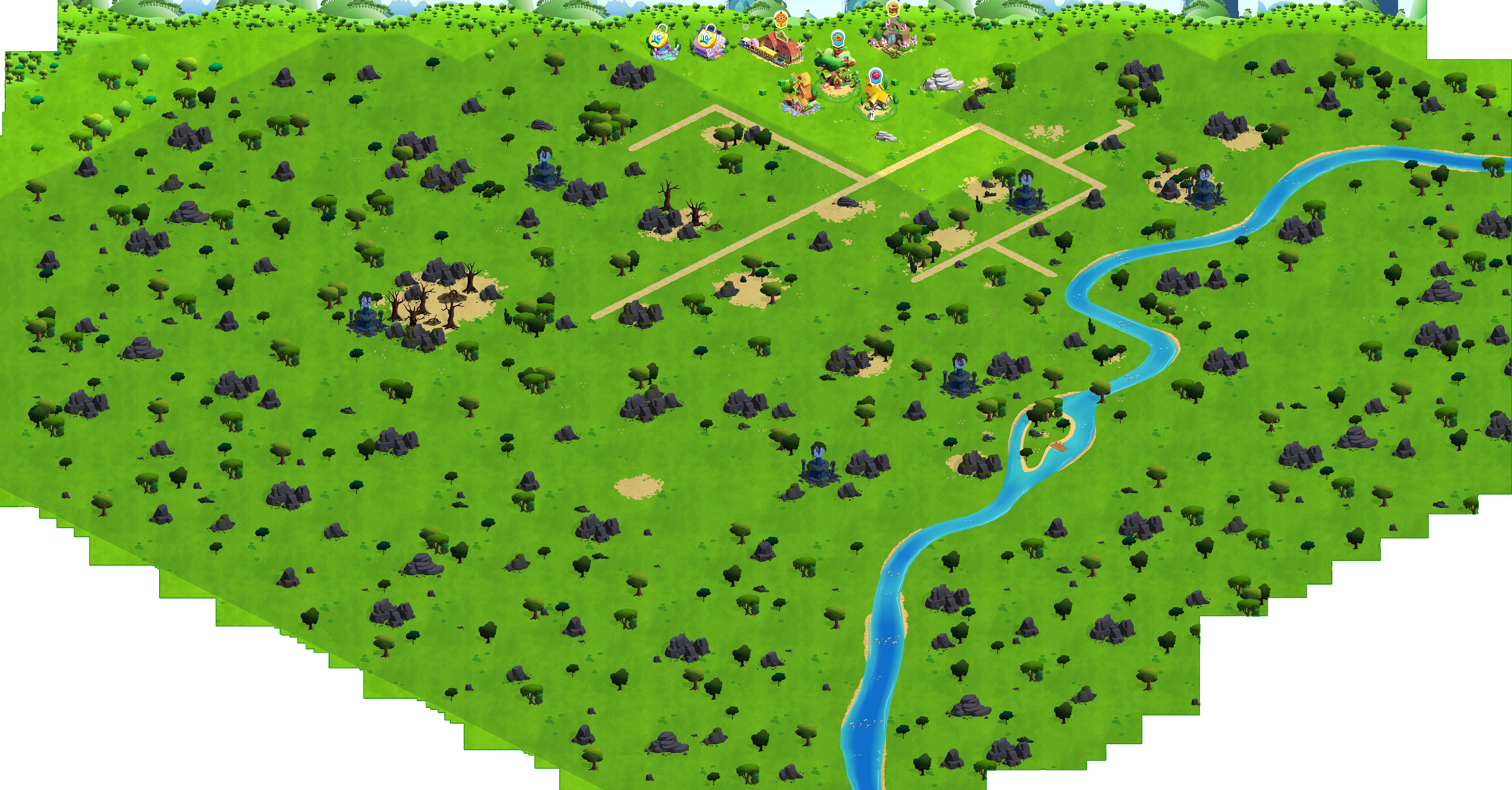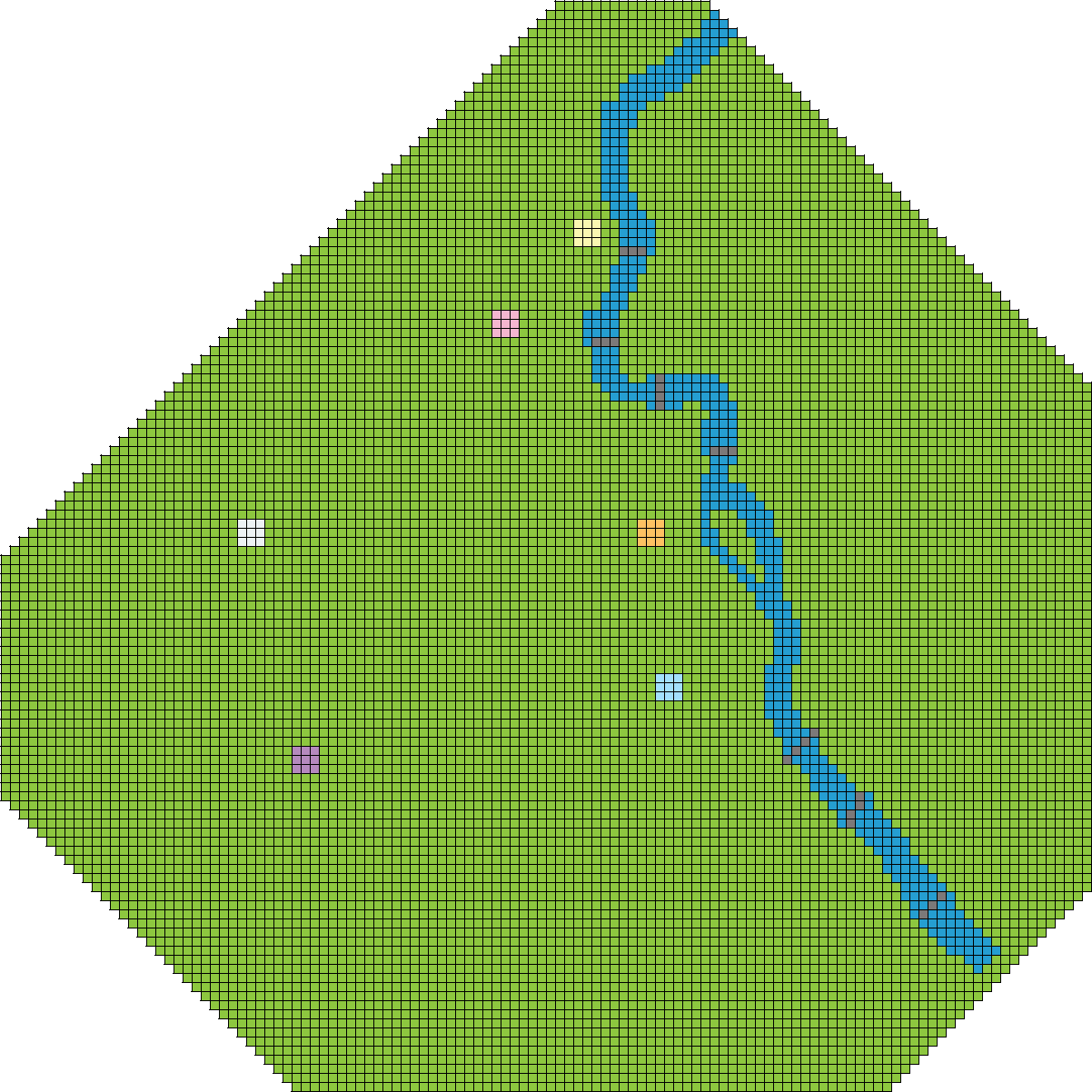 The Ponyville map is a square grid, rotated by 45 degrees and with truncated corners. This grid is used for the placement of buildings and decor, with each object occupying at least one grid cell. If the cardinal directions are assumed to reflect convention (that is, where north is up), the north corner is truncated more than the other three. The Train Station is located in the middle of the north side of the map, and the Ponyville River runs along the eastern edge, between the north side of the eastern truncation and the east side of the southern truncation, separating a small area from the rest of the map. Near the southern end, the river widens slightly and contains a small island. The six Harmony Stones, while scattered liberally across the map, are all located west of the river.
