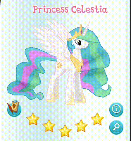 Princess Celestia is the ruler of Equestria. She resides in Canterlot Castle in Ponyville with Princess Luna and Disguised Celestia. It also appears in Canterlot and Crystal Empire and is voiced by Nicole Oliver. When tapped, says "Will you accept my friendship?" (Friendship is Magic - Part 2 episode) and "You need to make some friends".