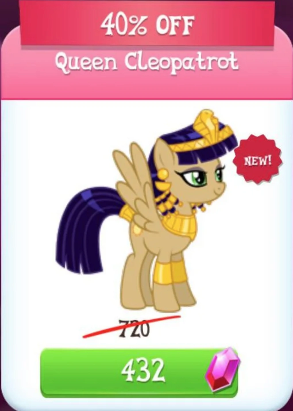 Queen Cleopatrot is a pegasus who lives in Ponyville. She was added in update 4.3. She is a helper in siege stages 2 and 3 of The League of Evil Limited-Time Siege.