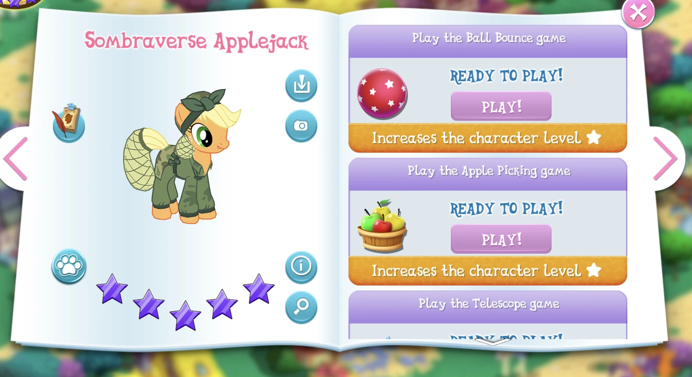 Sombraverse Applejack is a variant of Applejack added in Update 5.2. She is a Blitz helper in the Cutie Re-Mark: Sombraverse Limited-Time Blitz event, and a boss helper in siege stage three in The Cutie THREE-Mark LTS.