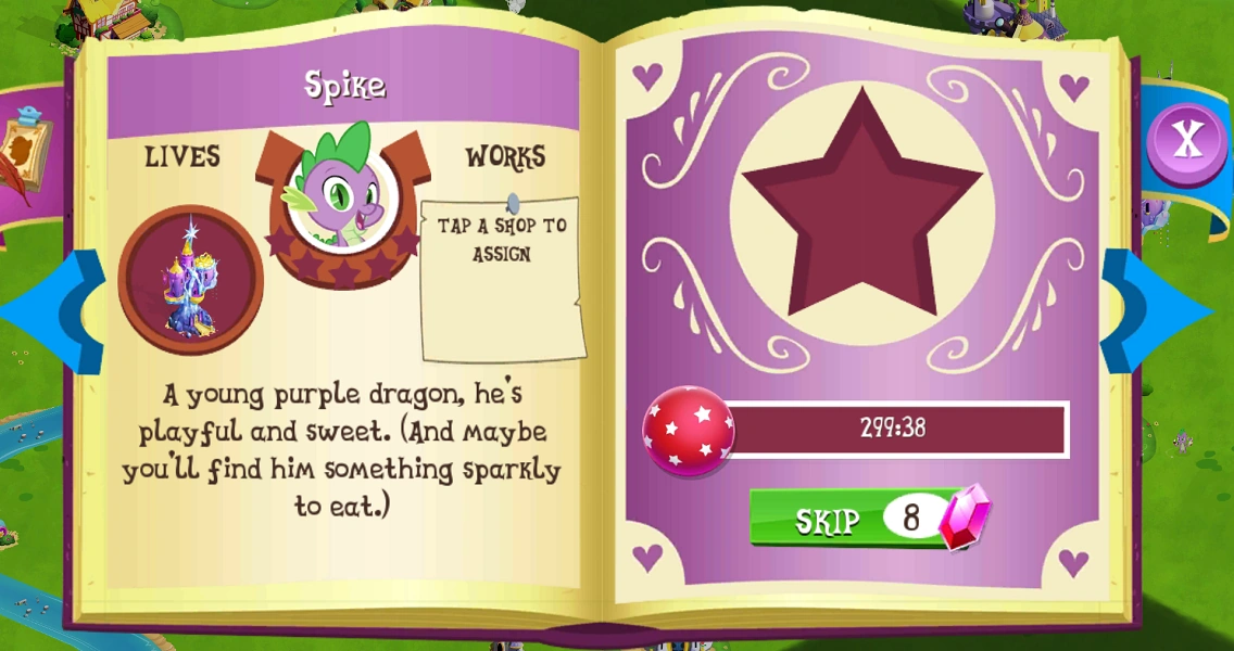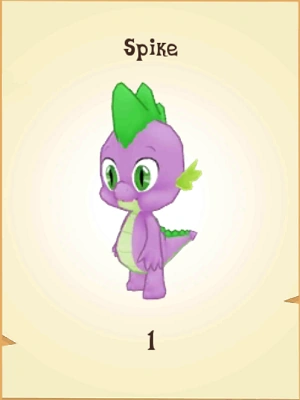 Spike is a baby dragon and Twilight Sparkle's assistant. In the game, he is a non-playable character who issues many quests, and who also narrates finished quests in later updates.