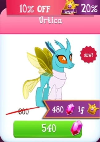 Urtica is a metamorphosed changeling that lives in Ponyville. She is a helper in the Convocation of the Creatures event, as well as in boss stage 4 of the Changeling History Limited-Time Siege. She used to be 600
